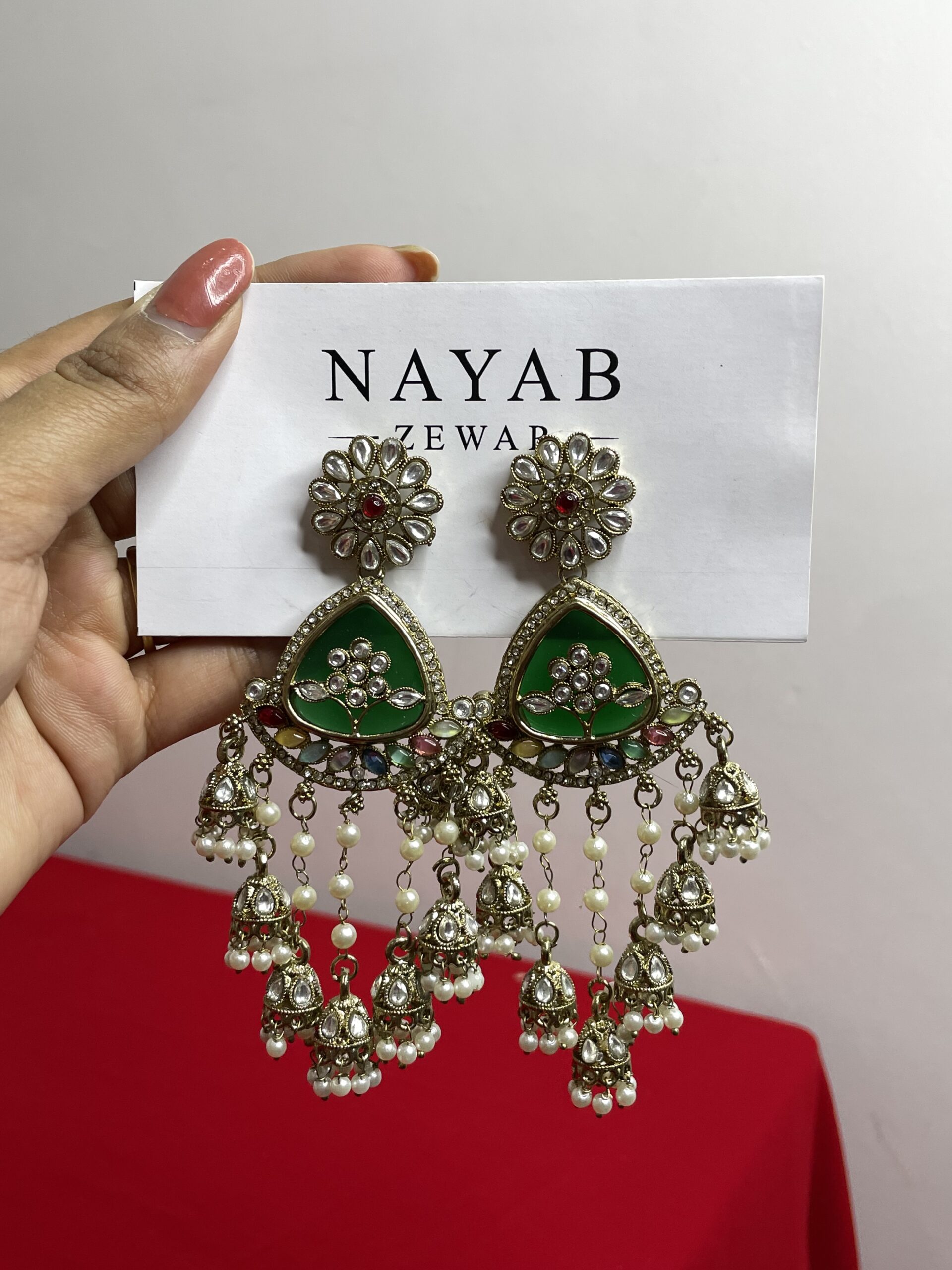 Be the first to review “Emerald Green Meenakari Jhumar Earrings with Floral Polki Studs”