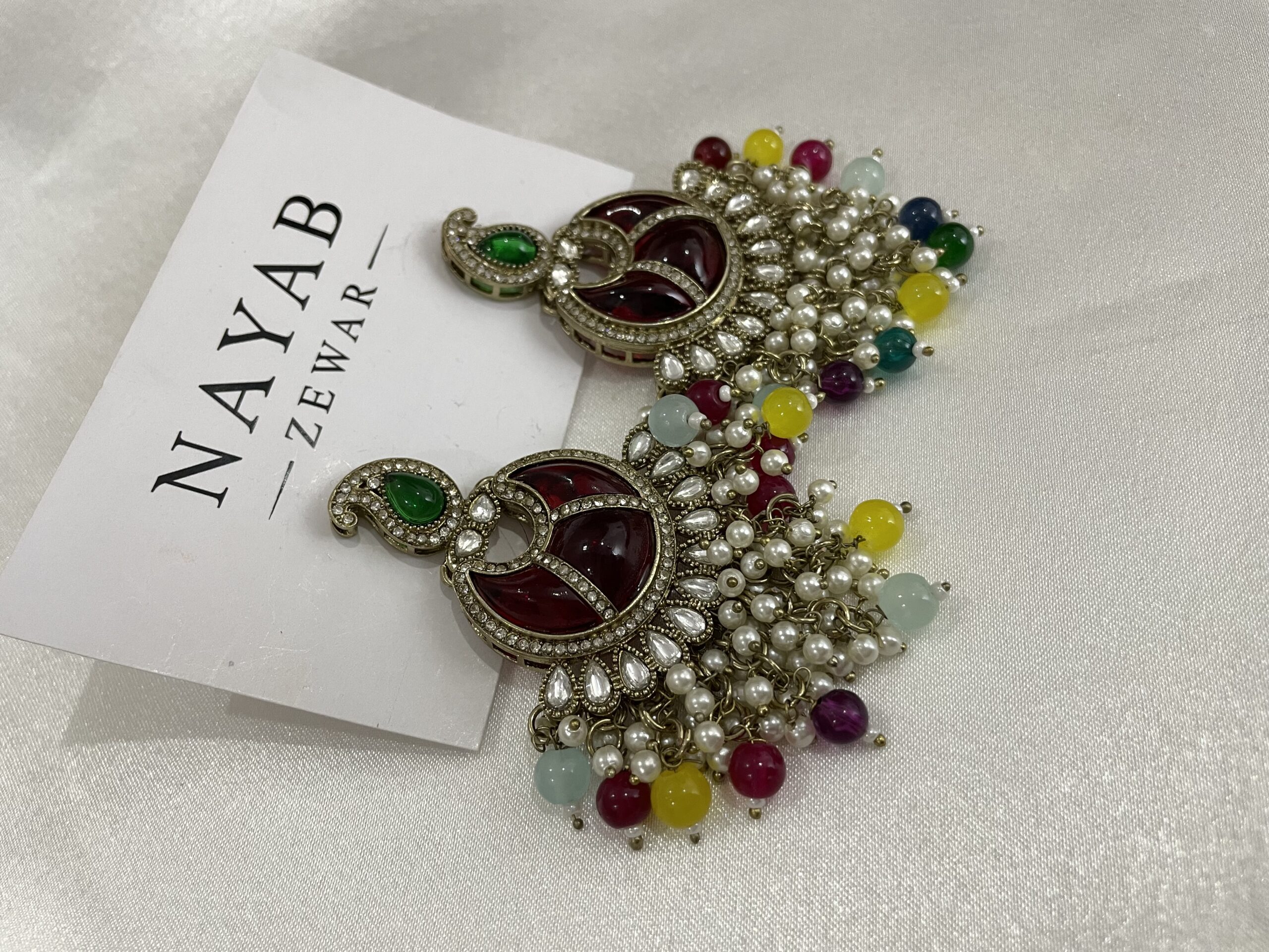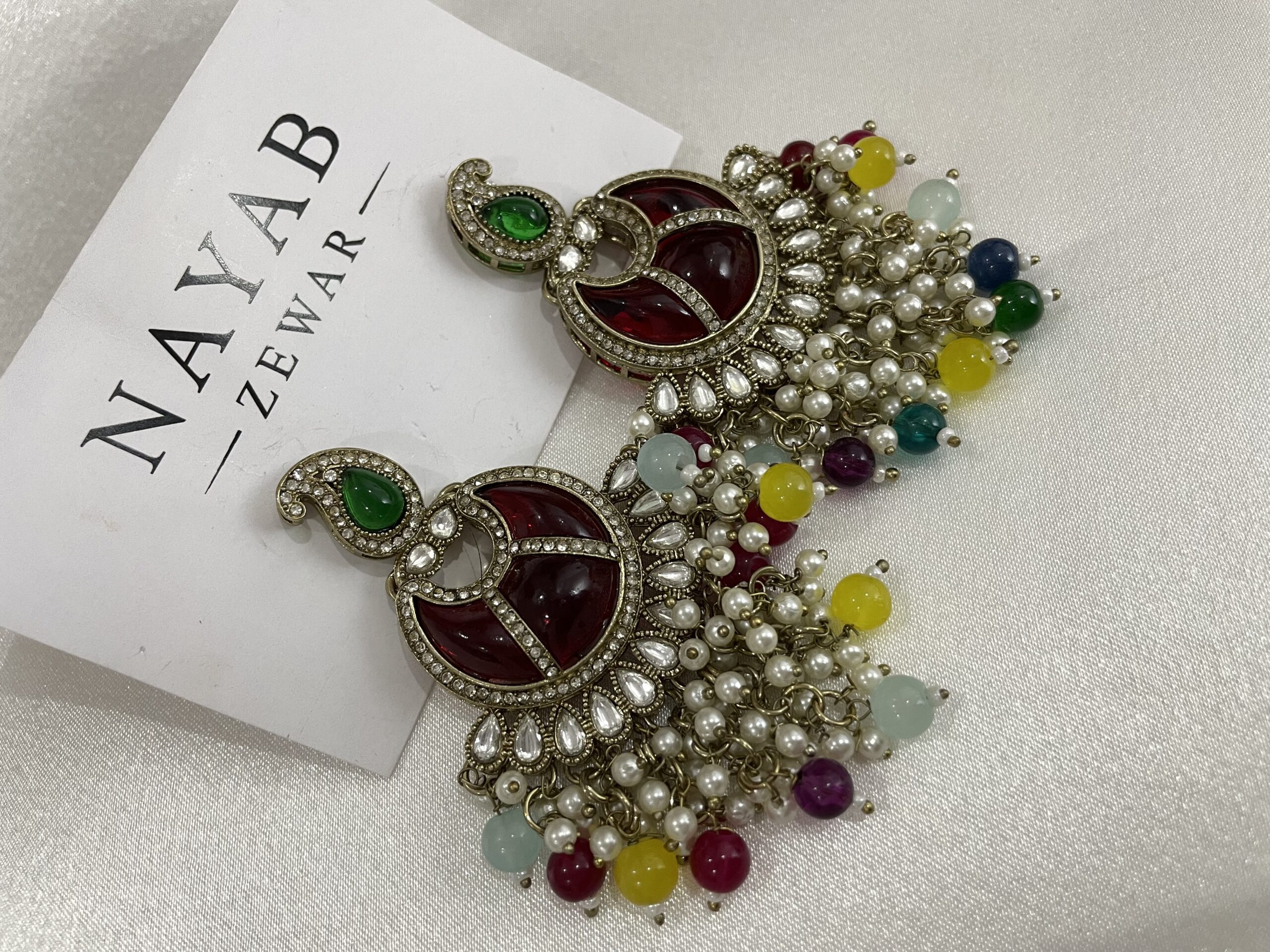 Be the first to review “Moon Earrings with Maroon Stones and Colorful Pearl Clusters”